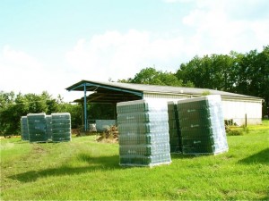 The ground was soggy this morning so the truck with the bottles got stuck in the mud. The driver had to unload 12,000 bottle hither and yon as best one could. This afternoon the man did a last minute deal to buy a rusty forklift without a guarantee to get them inside before nightfall.
