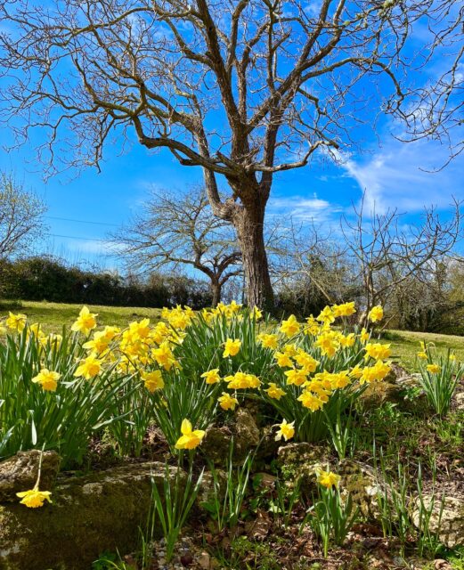 Today my daffodil pilgrimage takes me to the vineyard cottage where they always pop up suddenly after the February rains.   Their brilliance burns my eyes, but it is their incessant, incremental spread that gives me pause.    Fifty years on, they tunnel hidden roads and then pop up in the oddest places.   Under the rosemary bushes.   Far away under the plum trees.    Scattered amidst the stones of the old bread oven.   Fifty years on their flowers are a dance of golden froth.   Petals thin and delicate as parchment.