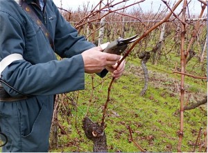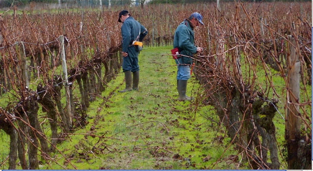 Not so easy. Here’s an example – you can see the principal branch arching from the trunk (the “pied de vigne”) to the left – it carried the main fruit bearing shoots for the 2012 harvest, and will now be cut off.  In fact everything but one branch that will support the 2013 harvest must be cut. That, plus a tiny shoot which will establish the harvest for 2014.  From a mass of branches per vine, the pruner’s choices have a crucial influence on quality, health and yield.Off hidden in a parcel of Merlot, I hear muted voices and the whir of pruning sheers. The men are concentrating so hard they don’t hear me coming (until Dante, our dog, comes racing up.) I find Denis standing in front of a tangle of vine shoots, studying, before he comes at it with his cutters. The subject of the “taille” is one of the most important in viticulture; it covers many chapters in my text book but is not fully learned in class, or mastered quickly. Styles of “taille” vary greatly depending on the region, varietal, local custom and objectives of the vigneron for the wine.  Denis started learning when he was a teenager, helping his father in this vineyard. He tells me every worker leaves a signature on the plant that influences its’ growth for years to come, so he’s picky about who he allows to touch the vines.
