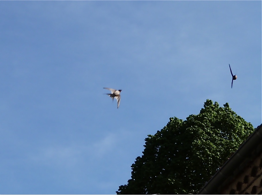 They are also fearless tribe protectors.  When a large sparrow hawk recently carried off a baby, panic and distress was followed by rally cries and strategic formations.  As the hawk swooped in on a second raid the tiny swallows surrounded him en masse in counter attack.The number of swallows in France has also fallen, often because pesticide use kills off their food.  Another reason is that they lost their homes when many of the old stone houses of southwest France were bought up in the 1980’s and ’90’s and restored.  (Often by the Brits, so this was nicknamed “The Second Invasion.” The first invasion being 1152 to 1453 when Aquitaine was sort of an English colony.)